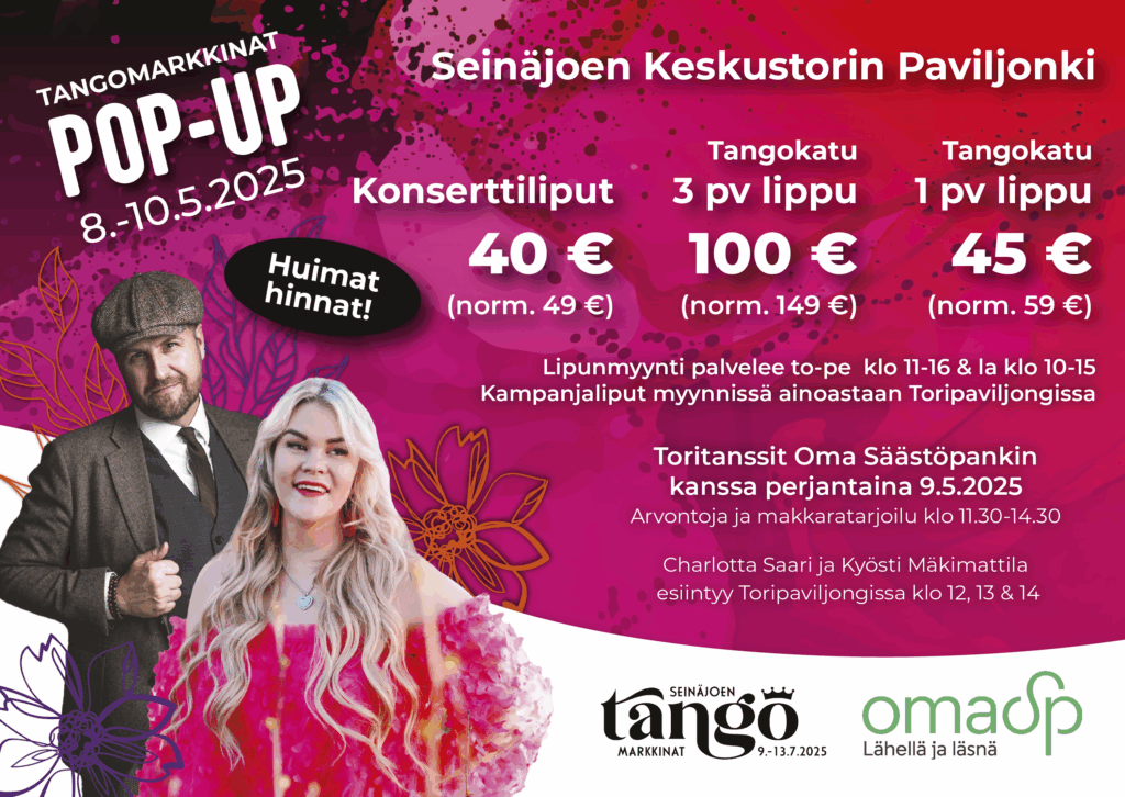 Tangomarkkinoiden POP-UP -lipunmyyntipiste palvelee Seinäjoen Keskustorin Paviljongissa torstaista lauantaihin 8.-10.5.2025! Pop up -lipunmyynti avoinna torstaina sekä perjantaina klo 11 – 16, ja lauantaina klo 10 – 15.